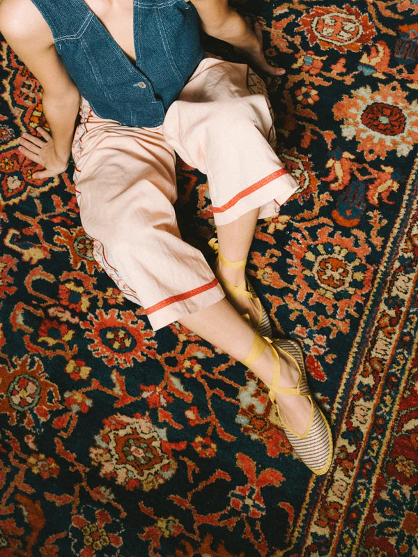 Las Loafers Straps Arizona, el rediseño de nuestras emblemáticas loafers, ahora con un cierre adaptable. Estas bailarinas están confeccionadas con un tejido exterior a rayas naranjas y blancas y combinado con lurex, lo que otorga un brillo al zapato que lo hace perfecto para cualquier ocasión. El ribete y la lazada son en en color amarillo también. El diseño está fabricado íntegramente en España y creado de manera artesanal en los materiales de la más alta calidad. Es un modelo alegre gracias a la elección del tejido exterior y la apuesta por las rayas que hace que estas loafers sean un acierto seguro para la temporada de verano.