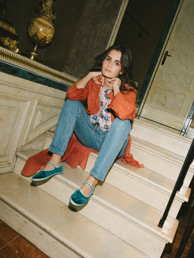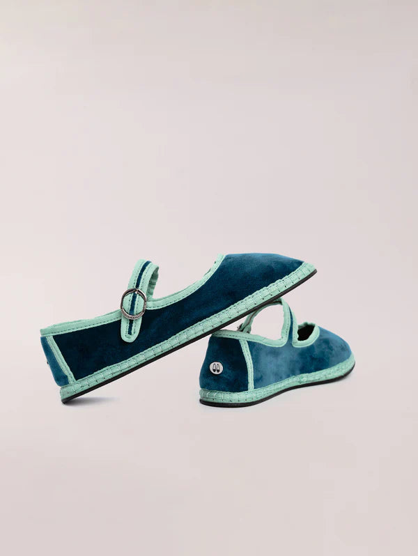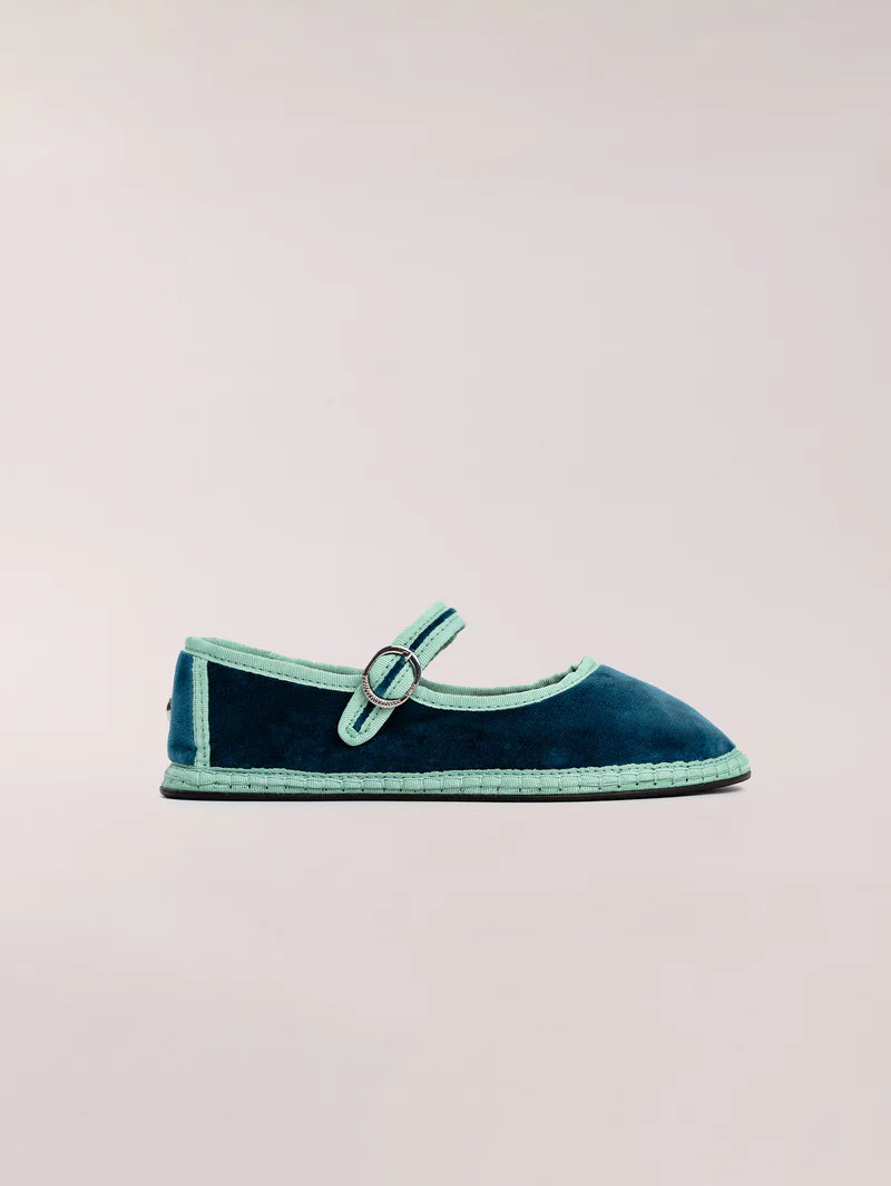 Las Mary Jane Cala, uno de los best seller de Sveti Stefan, están confeccionadas con un tejido exterior compuesto 100% en terciopelo de algodón en tono verde agua, en contraste con el ribete en color verde pastel. Es un modelo alegre que está diseñado para elevar tus looks más veraniegos.